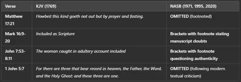 While the NASB keeps a word-for-word structure, it removes or brackets entire passages, introducing doubt about Scripture’s authenticity and diminishing confidence in the Word of God.