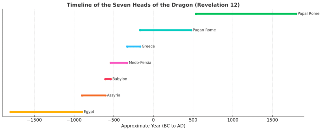 🔹 Seven Heads: These symbolize completeness of satanic influence across empires. They also represent the seven major world powers through which Satan has worked to persecute God’s people: