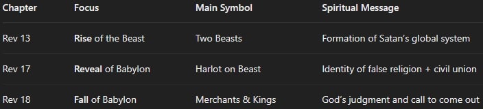 🔎 This chapter personifies Babylon as a harlot woman (false religion), riding a revived global system of power.