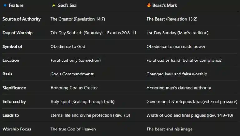 🔎 The seal of God is His name, His authority, and His law—specifically, the Sabbath, which honors Him as Creator. The mark of the beast, then, is a counterfeit sign of authority—honoring man-made tradition over divine command.