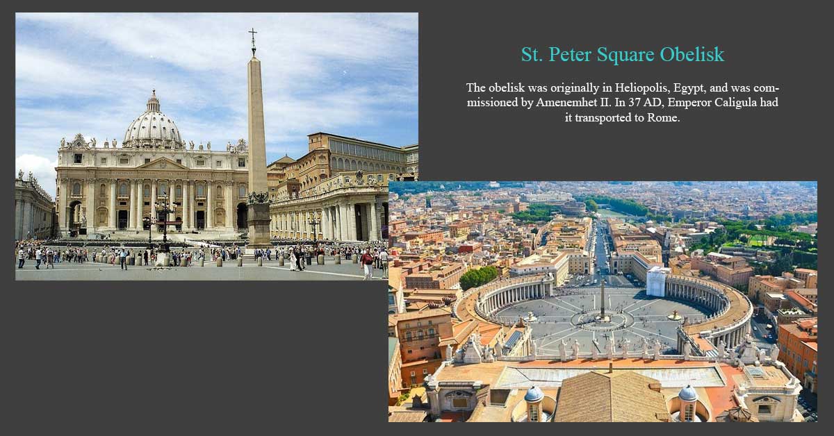 The Vatican Obelisk at St. Peter’s Square is an Egyptian phallic symbol once used in sun worship. Baal worship frequently involved phallic symbols as fertility representations.